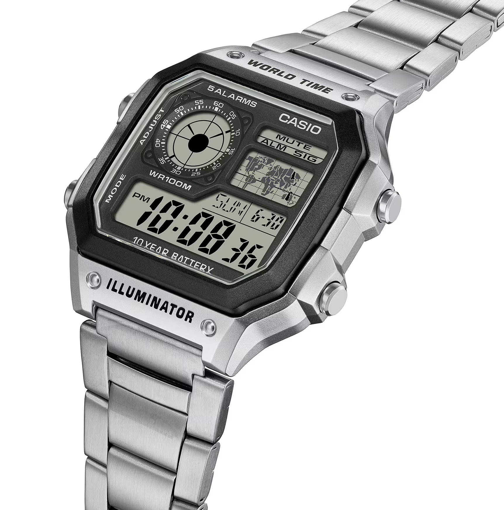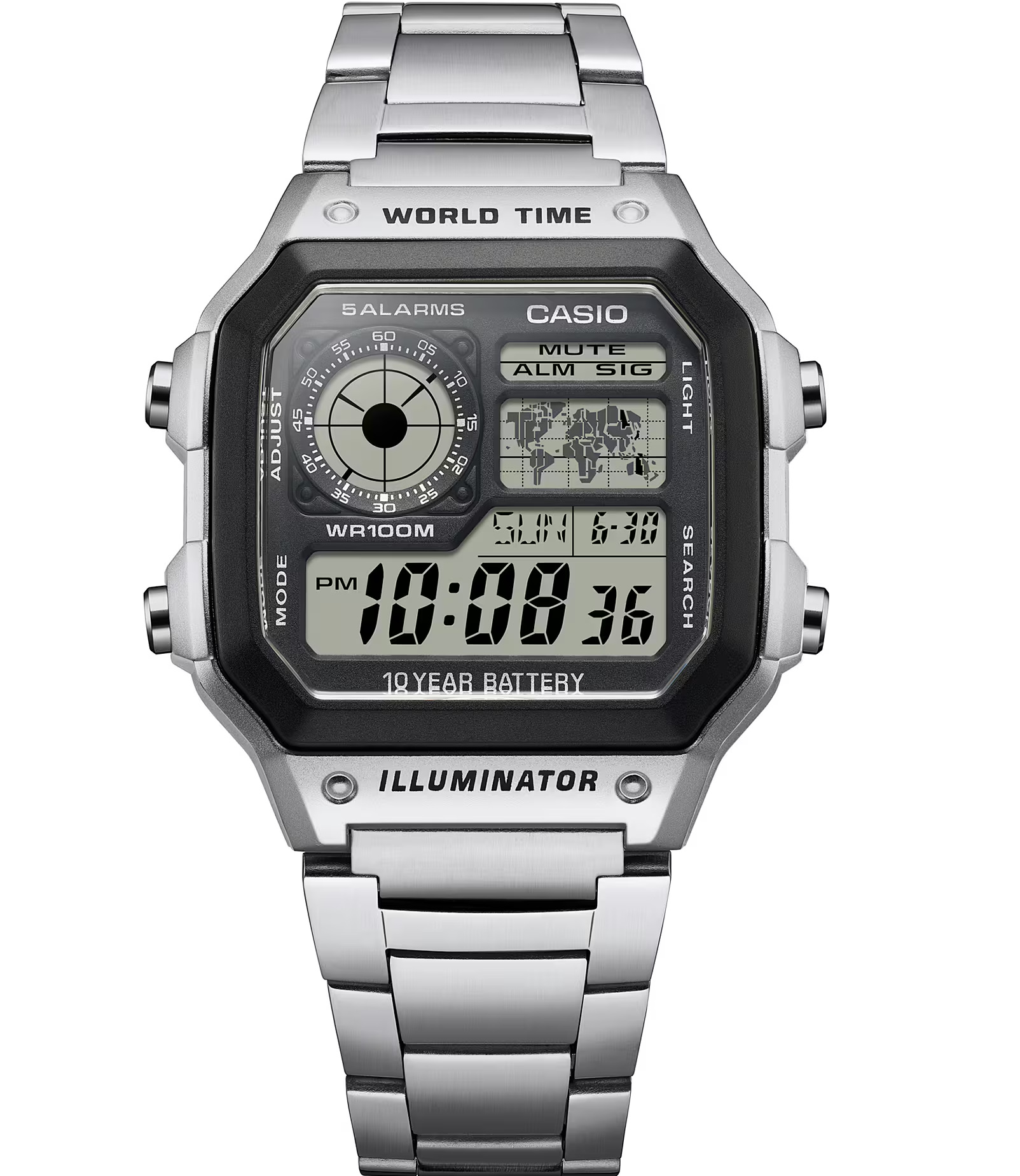 ساعت مچی مردانه کاسیو مدل AE-1200WHD-1A یکی از محبوبترین نسخههای سری شناختهشده World Timer کاسیو است؛ مدلی که سالهاست بهخاطر طراحی خاص، دوام فوقالعاده و امکانات کاربردیاش در میان طرفداران ساعتهای دیجیتال جایگاه ویژهای پیدا کرده است. این ساعت با ترکیب جذاب صفحه چهارگوش، نمایشگر چندبخشی و بند و قاب استیل ضدزنگ، ظاهری مدرن و مردانه دارد و بهراحتی با انواع استایلهای روزمره و اسپرت هماهنگ میشود.
