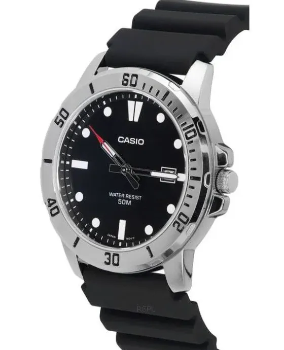 Casio MTP‑VD01‑1EV دارای بدنهای گرد و بند رزینی مشکی است که با صفحه سیاه ترکیبی کلاسیک و اسپرت خلق میکند. طراحی ساده و مینیمال این ساعت باعث میشود بهراحتی با لباسهای روزمره، اسپرت یا حتی رسمی ست شود. نمایشگر آنالوگ با سه عقربه (ساعت، دقیقه، ثانیه) و تقویم تاریخ، خوانایی مناسبی دارد و استفاده از آن را ساده و راحت میکند.